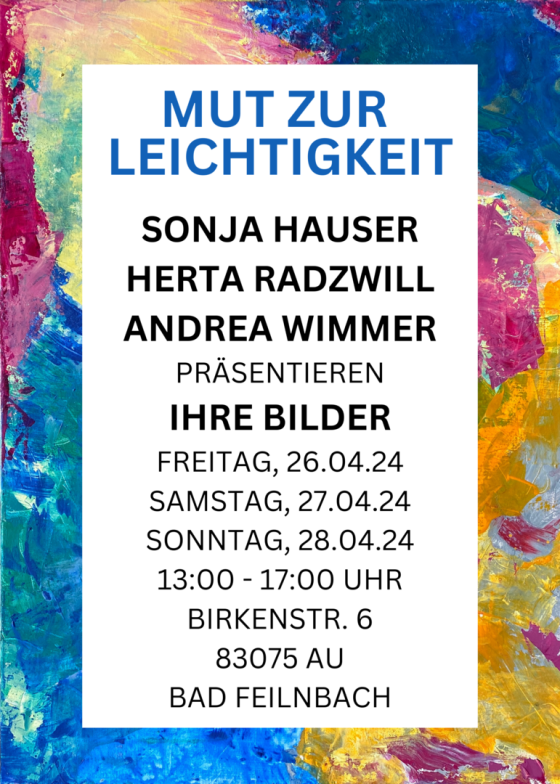 Malen ist eine Herzensangelegenheit von Andrea Wimmer aus Bad Feilnbach, Sonja Hauser aus Au und Herta Radzwill aus Bad Aibling. Unter dem Titel „Mit Mut zur Leichtigkeit“ präsentierten sie vor Kurzem ihre Kreationen in einer dreitägigen, mit viel Lob bedachten Ausstellung in den Räumlichkeiten und im Atelier von Marianne Igel der Öffentlichkeit.